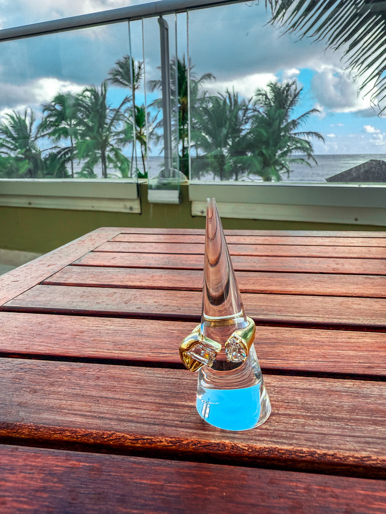 The CELESTE Ring captures modern elegance with a bold, molten wrap silhouette and shimmering CZ baguette teardrop centerpiece. Crafted from 24K gold-filled brass, it offers a rich golden luster that rivals fine jewelry — combining luxury with durability for everyday wear.