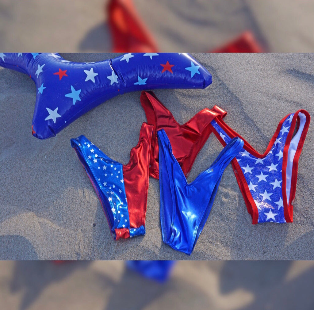 Brazilian cut metallic cheeky swimsuit bottom. Paired with a full coverage triangle bikini top.