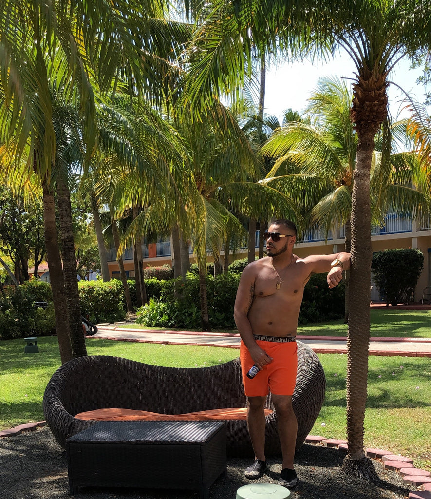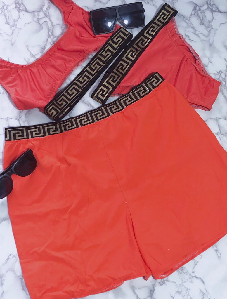 Men swim trunk features a black and gold elastic band and a vibrant orange polyester microfiber fabric. No pockets or adjustable waist strings.
