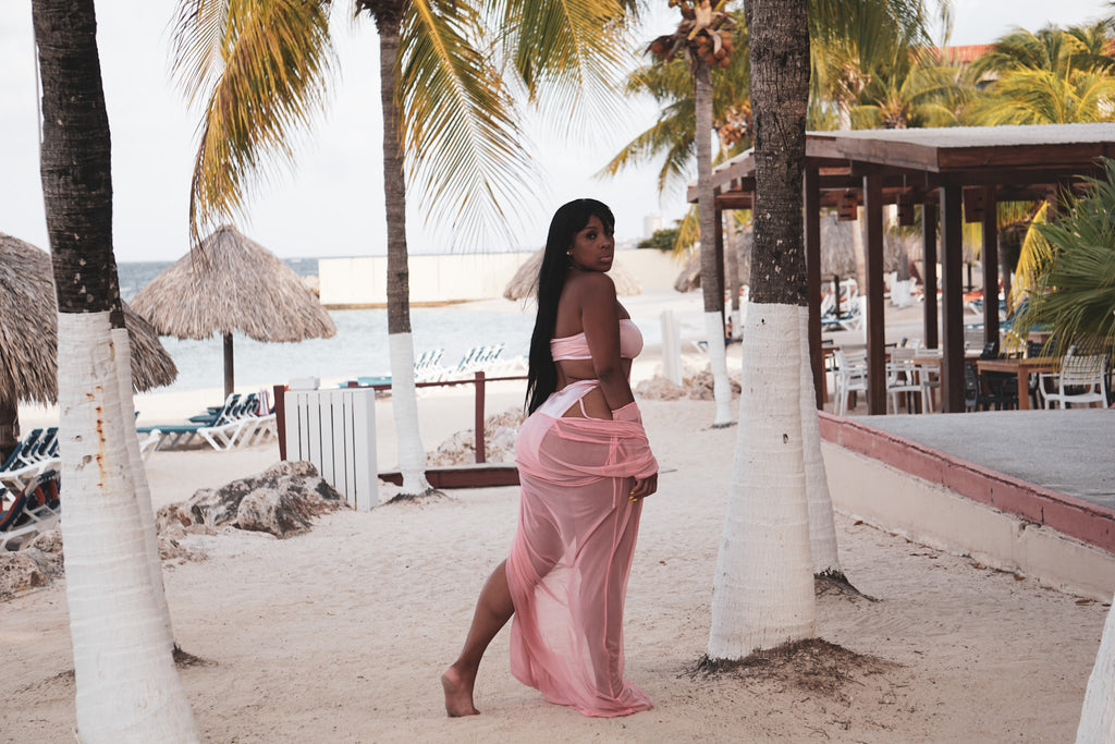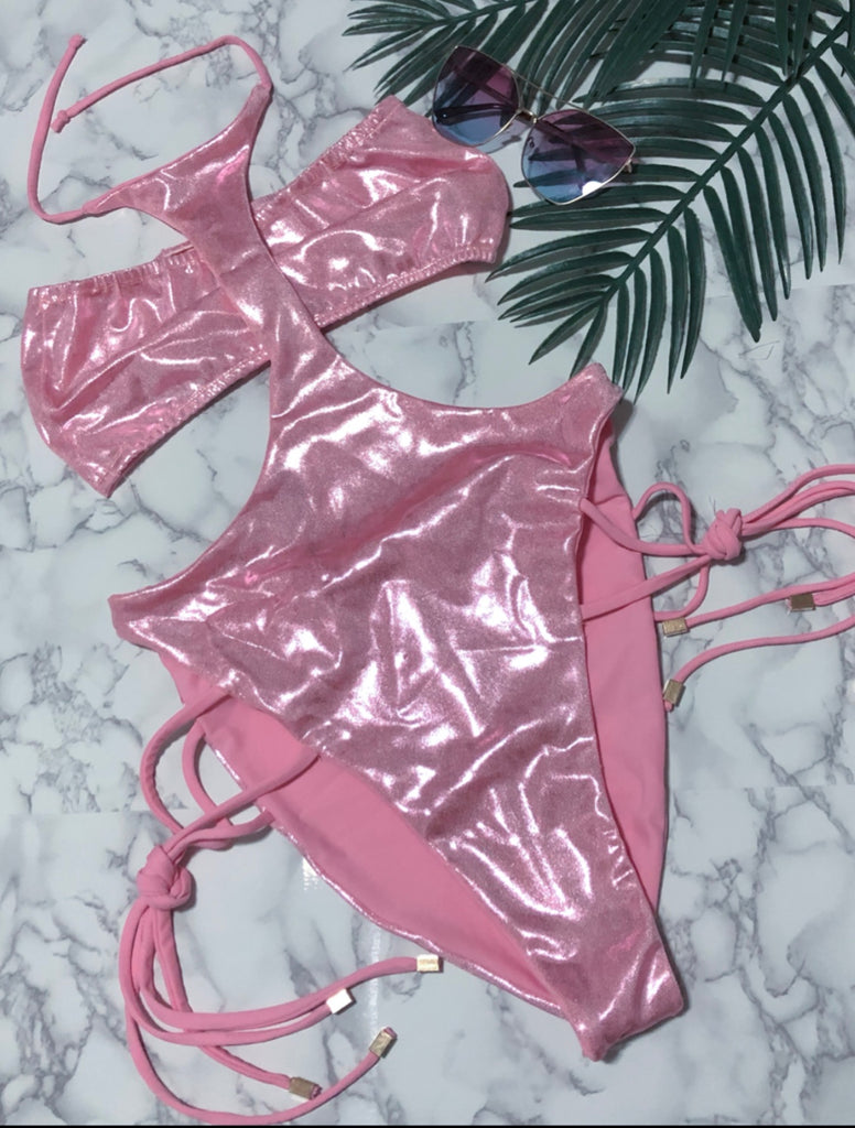 This swimsuit features a bandeau style top paired with a sexy high cut bottom. The bottom features a mid section that ties around the neck and also double side tie strings adjustable at the hip.
