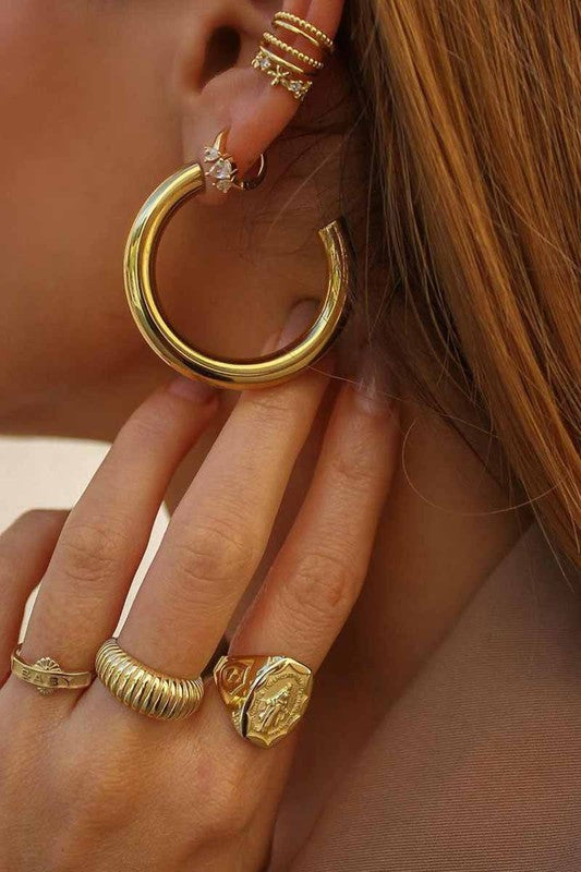 Crafted from 18K gold-plated stainless steel, TRISH is waterproof, hypoallergenic, tarnish-free, and fade-resistant, ensuring it keeps its brilliance through every wear. Adjustable for a comfortable fit, it’s your go-to ring for effortless elegance.
